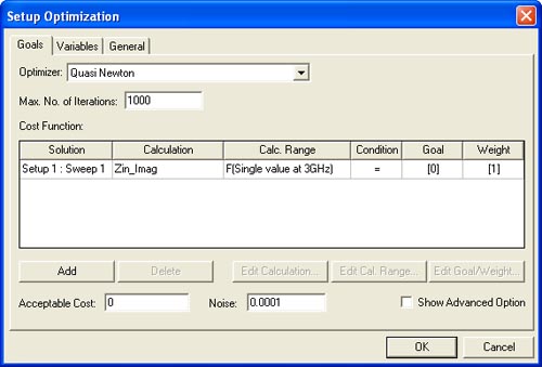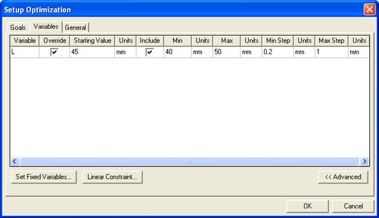 Figure 8. Optimization setup. Next, the variable for optimization has to be setup. Click on the Variables tab of the Optimization window. Click on Advanced and setup the options to be like Fig. 9. ,/p>