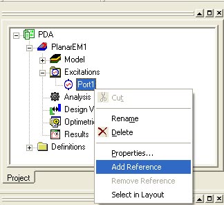 Figure 6. Differential port setup. Analysis SetupTo setup the analysis, go to Planar EM > Solution Setup > Add Solution Setup. Since this is a geometrically simple structure, a fixed mesh will give an accurate result. Use a fixed mesh with a frequency of 4.0 GHz. In addition, add a frequency sweep from 2.0 GHz to 4.0 GHz by going to Planar EM > Solution Setup > Add Frequency Sweep; do an interpolating sweep from 2.0 GHz to 4.0 GHz with 201 points. Next, analyze the problem. Plotting ResultsAfter the simulation is finish, we can plot the real and imaginary parts of the input impedance over the 2.0 Ghz to 4.0 GHz range to confirm the resonant frequency. Fig. 7 shows the resulting input impedance; the results show that the dipole resonants at 2.75 GHz (Imag(Zin)=0). As a result, we need to optimize the dipole arm length to obtain resonance at 3.0 Ghz.
