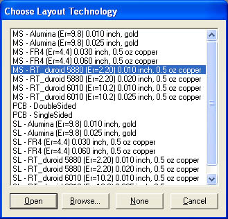 Figure 1. Model of printed dipole antenna based on differential feeding. Layers SetupFirst load up Ansoft Designer, then go to Project > Insert Planar EM Design to launch the MOM simulator. A window will appear asking you to choose a layout technology (substrate) as shown in Fig. 2. Pick MS - RT_duroid 5880 with a height of 0.010 inch. Once, you have chosen the technology, a project window will appear. Before we can setup the model, we need to remove the ground plane. To do this, go to Layout > Layouts and the Edit Layers window will appear. Select the ground layer and then click on Remove Layer. The Edit Layer window should look like Fig. 3, when the ground later is removed.