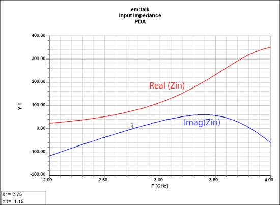 Figure 7. Input impedance of un-optimized printed dipole. OptimizationTo setup the optimization, go to Planar EM > Optimetrics Analysis > Add Optimization and a window will appear. In the optimization window, click on Add and then click on Edit Calculation. In the Edit Calculation dialog, create a new calculation called Zin_Imag and define it as im(Z(Port1,Port1)). Next, click on the Edit Calc Range and set it to a single frequency at 3.0 GHz. For the Condition set it to "=" and a Goal of 0. The completed window should look like Fig. 8.