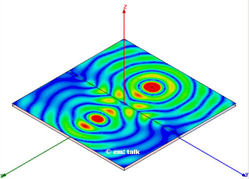 Left-Handed Materials: Effective Medium ApproachHFSSv9.2 (download simulation file) Materials with simultaneous negative permittivity and permeability referred to as left-handed materials was first theorized in the 1960s. Left-handed materials support backward-waves (i.e. phase and group velocity are opposite) and therefore have a negative refractive index. In this tutorial, the negative refractive index of a left-handed material is used to demonstrate a flat lens. This concept is based on Snell's Law of Refraction and is depicted in Fig. 1. If a point source is placed in the right-handed medium (RHM), a image of the point source will be reproduced in the left-haned medium (LHM). The left-handed medium for the flat lens is realized in HFSS with an effective medium approach; the substrate is assigned a constant negative value of permittivity and permeability.