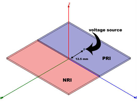 Model SetupTo realize the lens, a parallel plate waveguide is half-filled with a RHM and half-filled with a LHM. The refractive index of the LHM will be the negative of the RHM. A point source is placed in the RHM and it is expected that its image will occur in the LHM. Fig. 2 shows the model setup used for the simulation. The size of each region is 25.0x20.0x1.0 mm3 and radiation boundary is placed on all 4 edges of the parallel plate waveguide. The entire parallel plate is realized by two separate rectangular parallel plates. A voltage point source is placed in the RHM 12.5 mm away from the RHM/LHM interface.