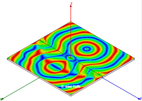 Plotting Field ResultsAfter the analysis is completed, the top of the parallel plate is selected and the electric field is plotted. Fig. 5 shows the electric field magnitude, while Fig. 6 shows the electric field phase. Both figures confirm that the flat lens works. In addition, Fig. 7 shows the animated electric field magnitude as a function of phase. Since the LHM supports a backward-wave, the field in the LH region appears to be moving backwards.