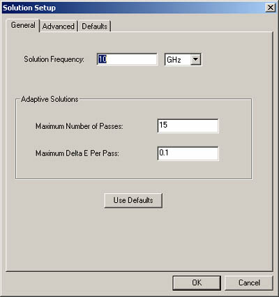 Analysis SetupTo simulate the flat lens, an analysis setup has to be performed. The solution frequency used is 10.0 GHz with an adaptive pass of 15 and a Delta of 0.1. Fig. 4 shows the Analysis Setup window with the relevant values.
