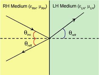 Figure 1. Snell's law applied to the interface of a RHM/LHM. Left-handed materials have lead to novel microwave antennas, resonators, waveguides, and lenses. In this tutorial, a novel flat lens is demonstrated using an effective medium approach. Such a flat lens is not possible with conventional microwave substrates or materials. The following topics are covered: