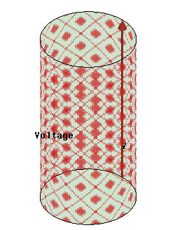 Effective Medium SetupIn this section, the RHM and LHM's permittivity and permeability is setup in HFSS. The RHM will have a positive refractive index (PRI) of n=3.16, while the LHM will have a negative refractive index (NRI) of n=-3.16, where n=sqrt(μ·ε). To setup the permittivity and permeability required to realize each region, a RHM and a LHM needs to be created. To do this, select the RH region of the parallel plate waveguide and then Assign Material. Once in the Assign Material window, choose View/Edit Material and create a new material named RH_Material with a permittivity of 10.0 and a permeability of 1.0. Do the same for the LH region of the parallel plate waveguide, but this time make a new material named LH_Material with a permittivity of -11.1 and permeability of -0.9. The difference in the numerical values between the RHM and LHM is to create a impedance mismatch to prevent the formation of constructive interference at the interface. Voltage Source SetupA voltage source (cylindrical waves) is placed 12.5 mm away from the interface in the RHM. To do this, a cylinder with a height of 1.00 mm and a radius of 0.25 mm is created and assigned the RH_Material. To setup the excitation select the face of the cylinder and go to Assign Excitation>Voltage... leave the default values but for the E-Field Direction, setup a New Line... from the bottom of the cylinder to the top. Fig. 3 shows the completed voltage source with the line direction.
